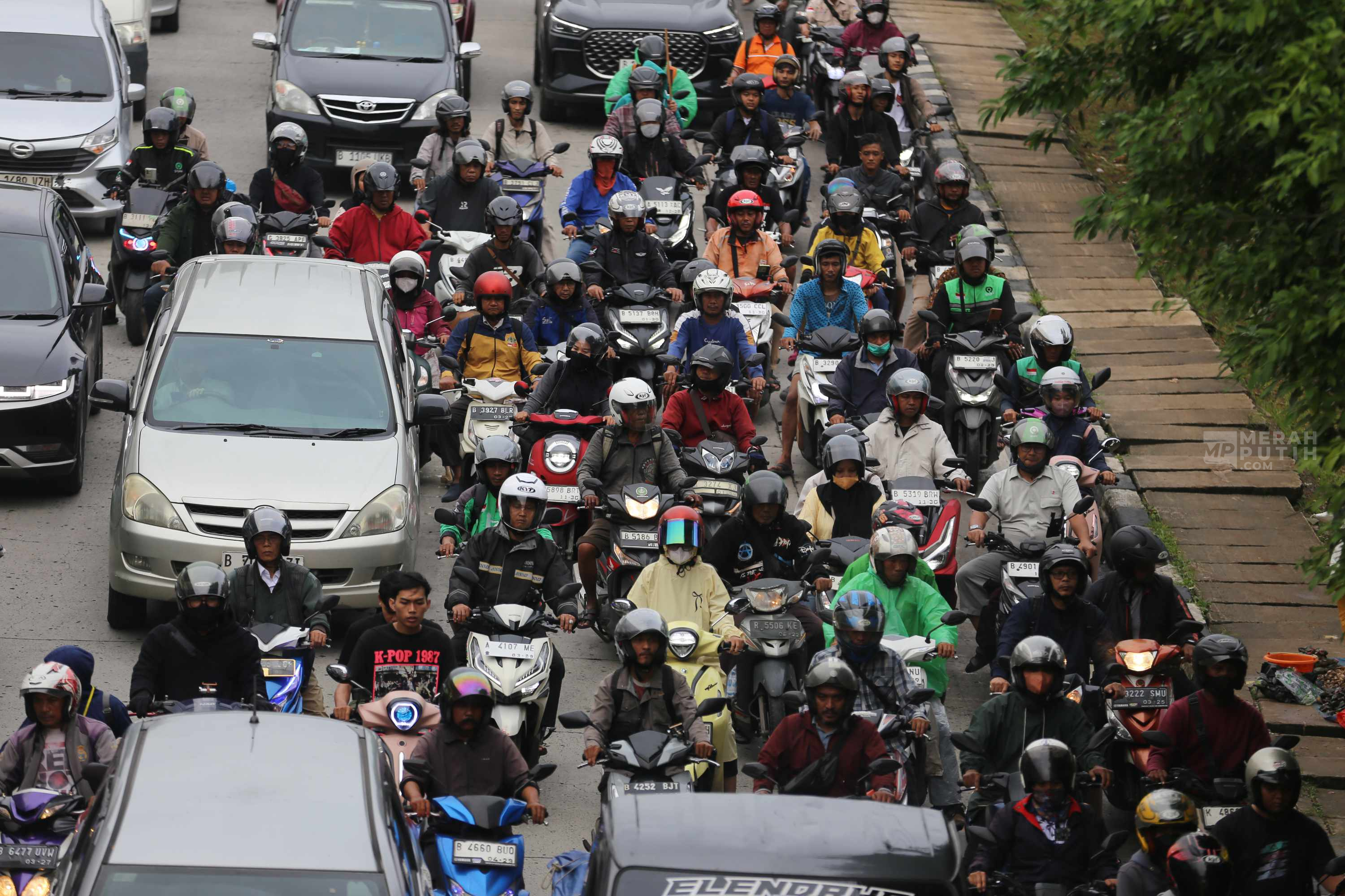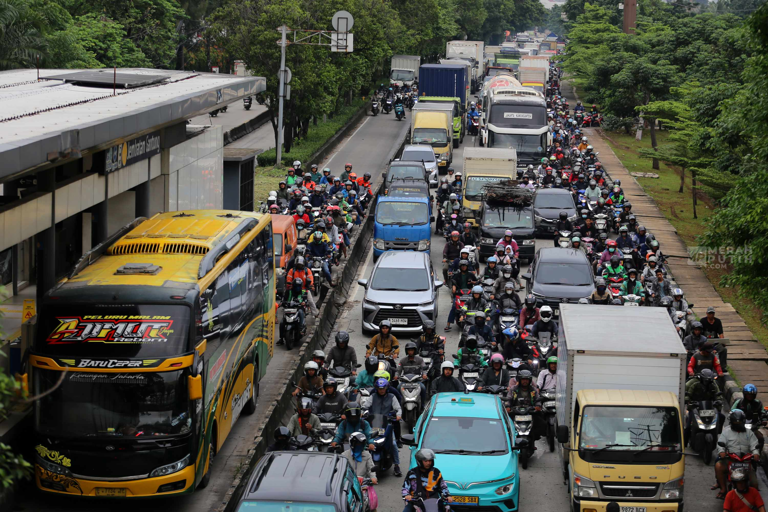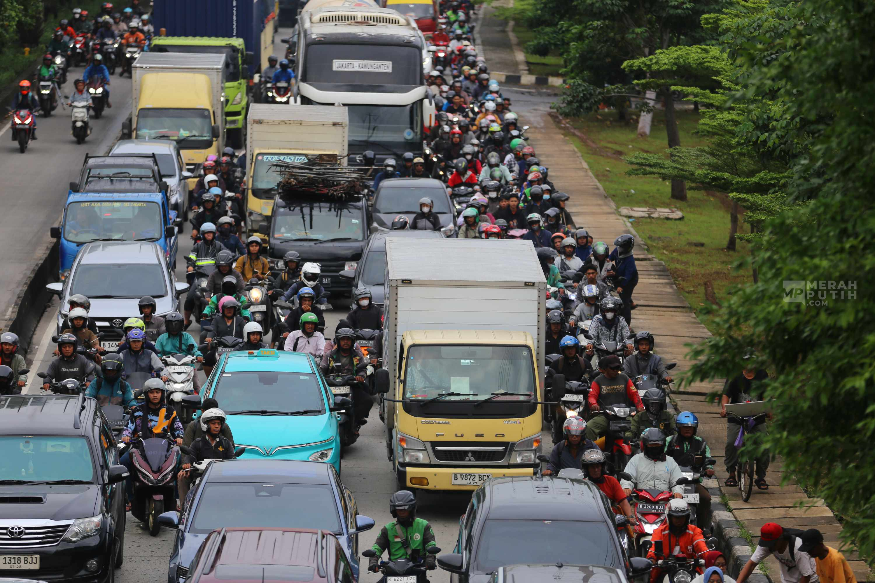 Kondisi ini memicu kemacetan lalu lintas dari arah Grogol menuju Cengkareng dan Tangerang. Antrean kendaraan terjadi karena pengendara harus melintasi genangan air. Selain memperlambat laju kendaraan, genangan juga menyebabkan sejumlah sepeda motor mogok, terutama saat volume lalu lintas meningkat pada jam pulang kerja. Hal tersebut semakin memperparah kepadatan di ruas jalan tersebut. (Foto: MP/Didik Setiawan).