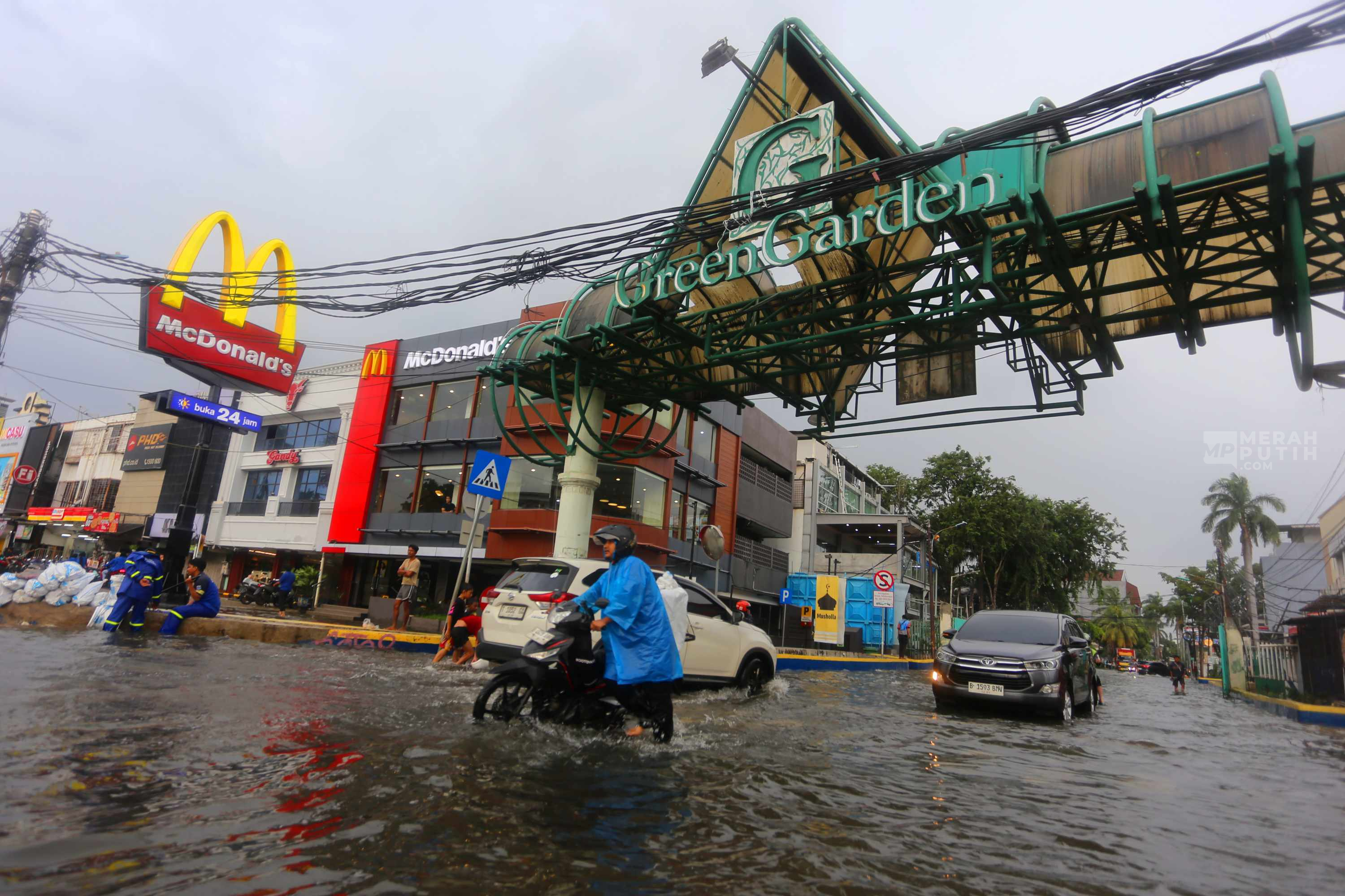 Merahputih.com - Sejumlah kendaraan melintasi banjir setinggi 30 sentimeter genangi di Jalan Panjang, Kawasan Green Garden, Kedoya, Kebon Jeruk, Jakarta Barat, Jum'at (23/1/2026).