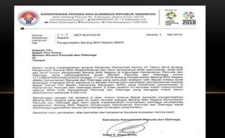 Kemenpora menyurati Roy Suryo meminta segera mengembalikan barang milik negara. Melalui surat bernomor 5-2-3/SET.BIII/V/2018 yang ditandatangani Sesmenpora Gatot S. Dewa Broto tertanggal 1 Mei 2018.