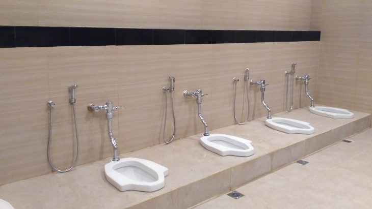 Nuansa mewah tampak pada toilet ini. Lantainya menggunakan marmer. Closet tersedia dalam bentuk closet duduk dan jongkok. Sejumlah penyejuk udara atau air conditioner (AC) juga terlihat di luar toilet.