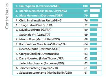 Hasilnya, dengan mengejutkan nama Emir Spahic menempati posisi teratas, bek Bayern Leverkusen itu mendapat nilai 100. sedangkan diurutan kedua ditempati Martin Demicelis dari Manchester City dengan nilai 89. Dan di posisi ketiga, Bek Borussia Dortmund, Mats Hummels meraih nilai 79.
