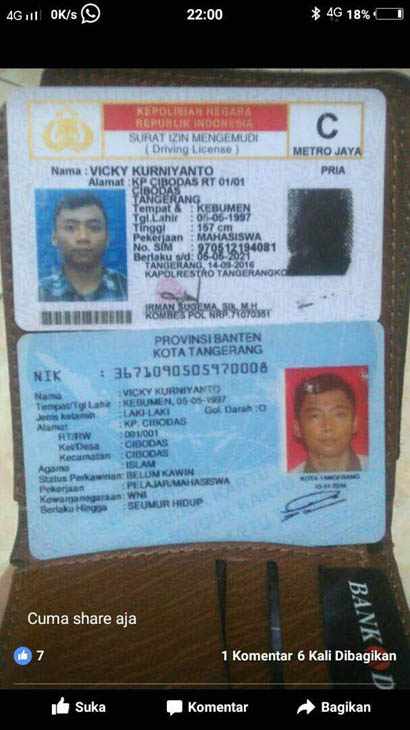Polisi menemukan sebuah tanda pengenal saat melakukan penyisiran di lokasi ledakan di Kampung Melayu, Jakarta Timur, Rabu (24/5) malam. KTP dan SIM tersebut atas nama Vicky Kurniyanto, warga Kampung Cibodas, Tangerang Rt 01/Rw 01.