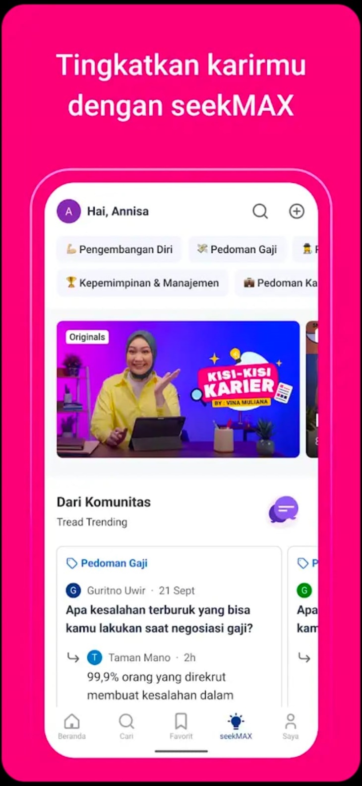 Forum diskusi ini dibuat seperti menfess yang sering ditemukan di Twitter. Selain itu, dalam komunitas seekMAX juga menyediakan konselor yang profesional untuk menjawab pertanyaan seputar psikologi. "seekMAX adalah salah satu learning platform JobStreet,” kata Sawitri.