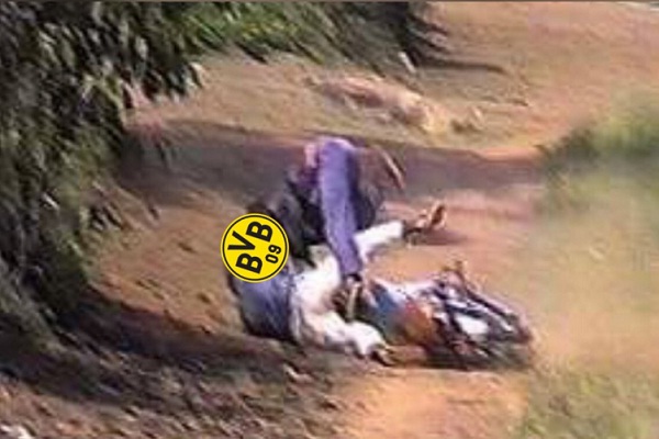 Digambarkan dalam meme kocak, dua orang pengendara motor supporter Dortmund terjungkal dari kendaraannya.