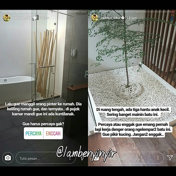 "Di ruang tengah, ada tiga hantu anak kecil. Sering banget mainin batu ini. Percaya atau enggak gue emang pernah lagi kerja denger orang ngelempar2 batu ini. Gue pikir kucing. Jangan2 enggak," kata Radit yang juga melampirkan ruangan tersebut.
