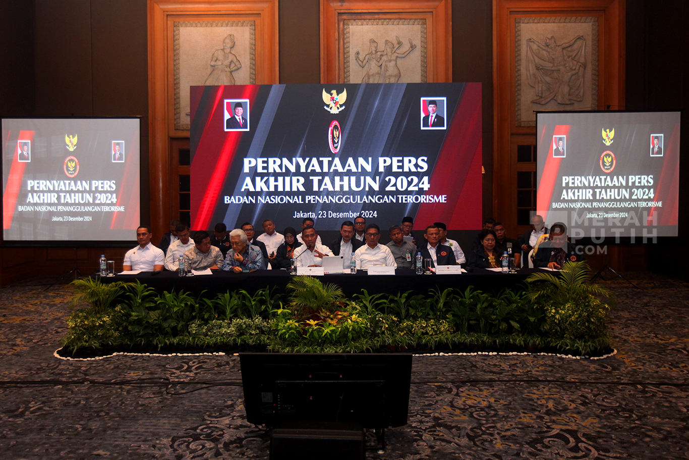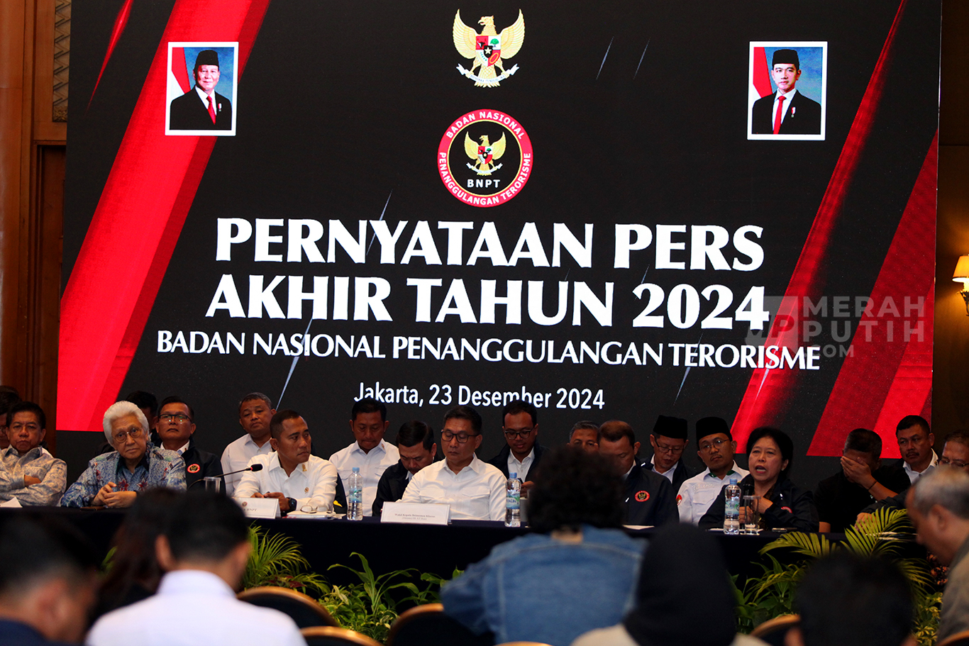 Badan Nasional Penanggulangan Terorisme (BNPT) memaparkan capaian kinerja sepanjang tahun 2024 dalam upaya penanggulangan terorisme pada Pernyataan Pers Akhir Tahun 2024 BNPT di Hotel Aryaduta di Jakarta.