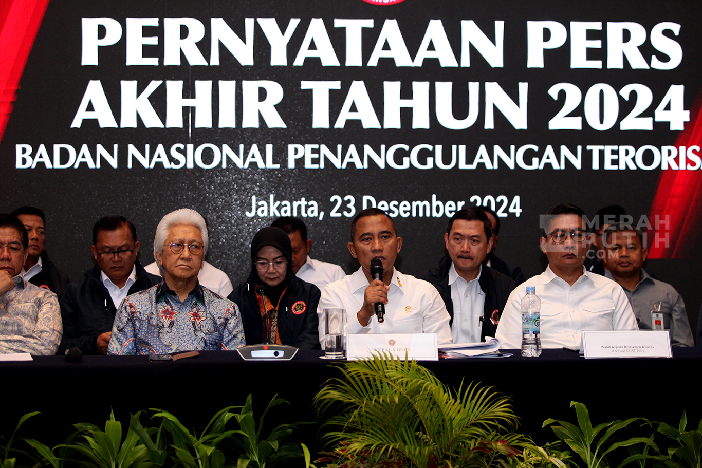 Merahputih.com - Kepala Badan Nasional Penanggulangan Terorisme (BNPT) Komjen Pol Eddy Hartono saat menyampaikan keterangan pers akhir tahun Capaian Kinerja BNPT tahun 2024 di Jakarta, Senin (23/12/2024).