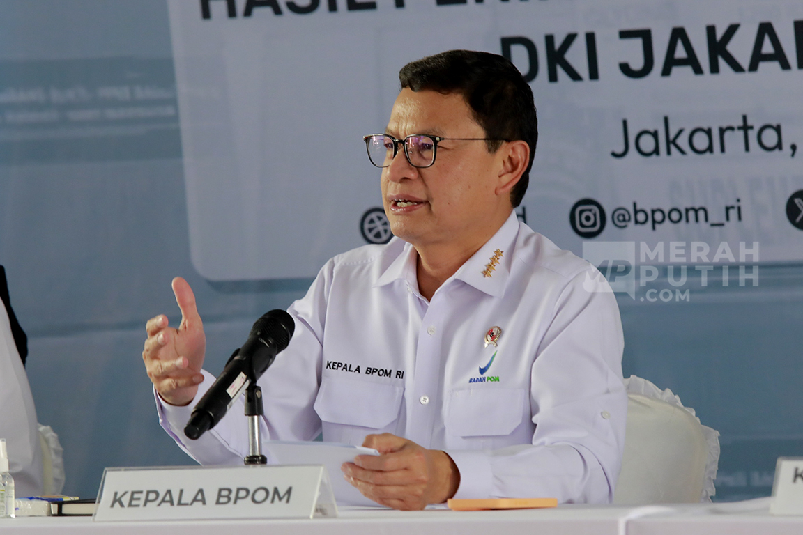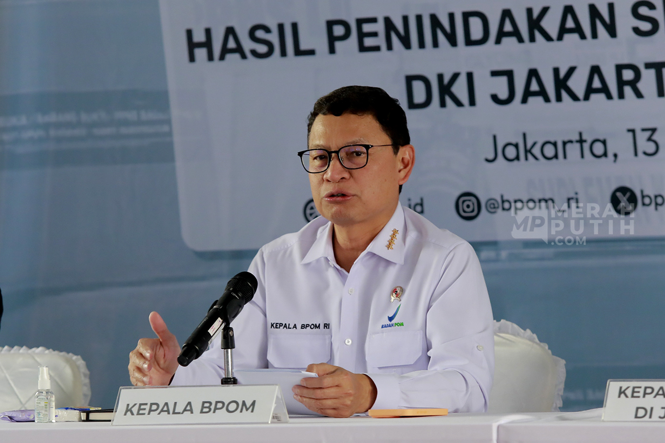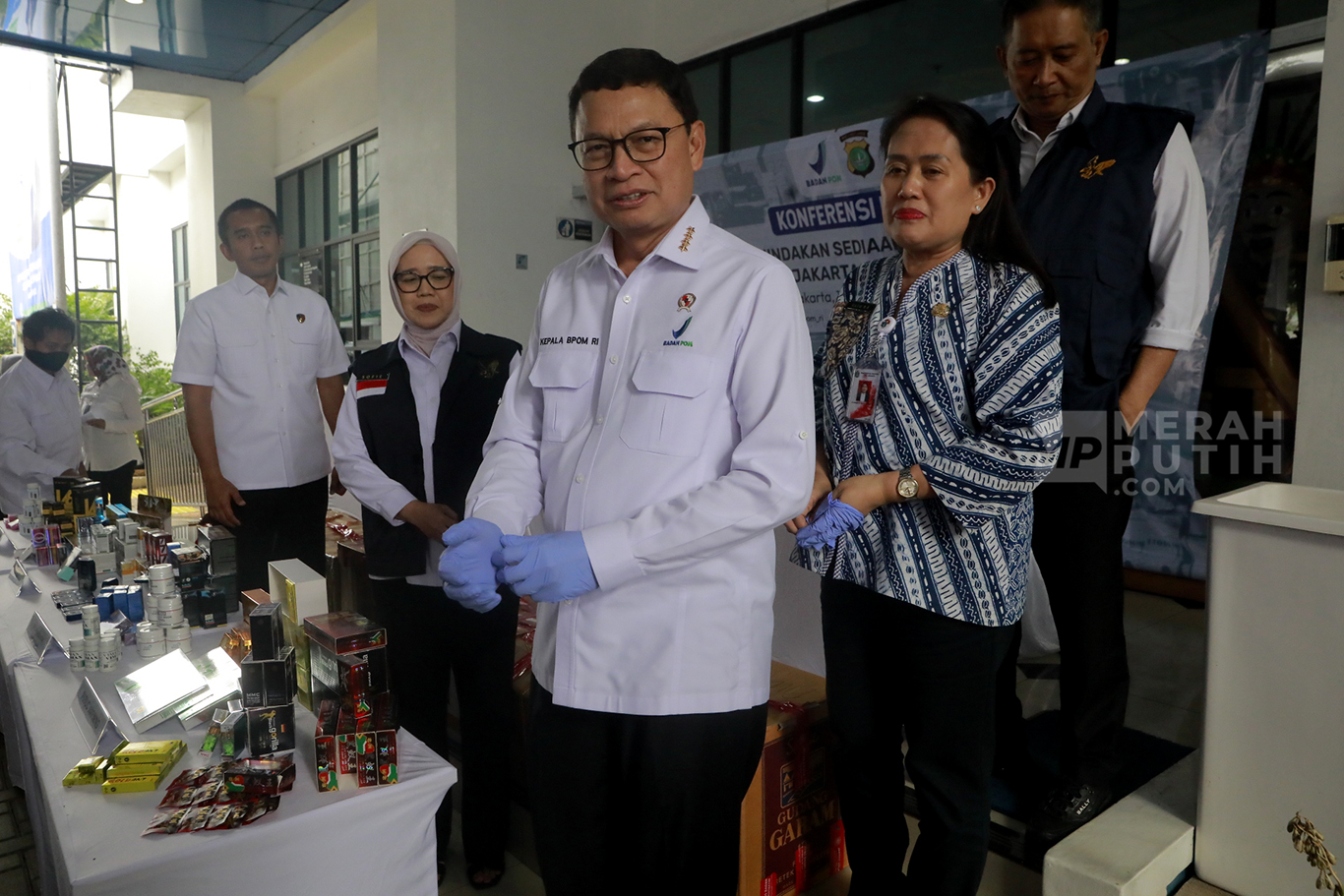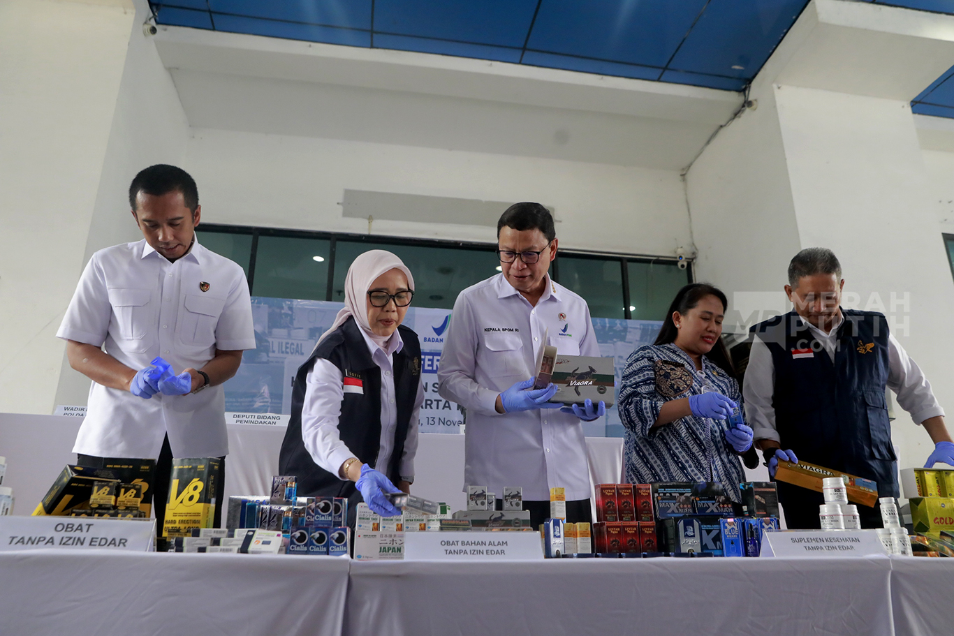 Merahputih.com - Kepala BPOM Taruna Ikrar (tengah) bersama Kepala BBPOM di Jakarta, Sofiyani Chandrawati Anwar, Kepala Dinas Perindustrian, Perdagangan, Koperasi, Usaha Kecil dan Menengah (PPKUKM) Provinsi DKI Jakarta, Elisabeth Ratu Rante Allo, Pejabat Kepolisian Polda Metro jaya dan pejabat BPOM menunjukan hasil sitaan obat farmasi ilegal saat konferensi pers di gedung kantor BPOM, Jakarta Timur, Kamis, (13/11/2025).