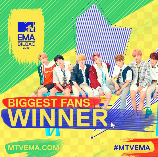 Untuk tahun ini, boy band asal Korea, BTS, sukses membawa pulang dua penghargaan bergengsi dari MTV EMAs 2018. Penghargaan tersebut untuk kategori grup terbaik dan penggemar terbesear tahun ini.