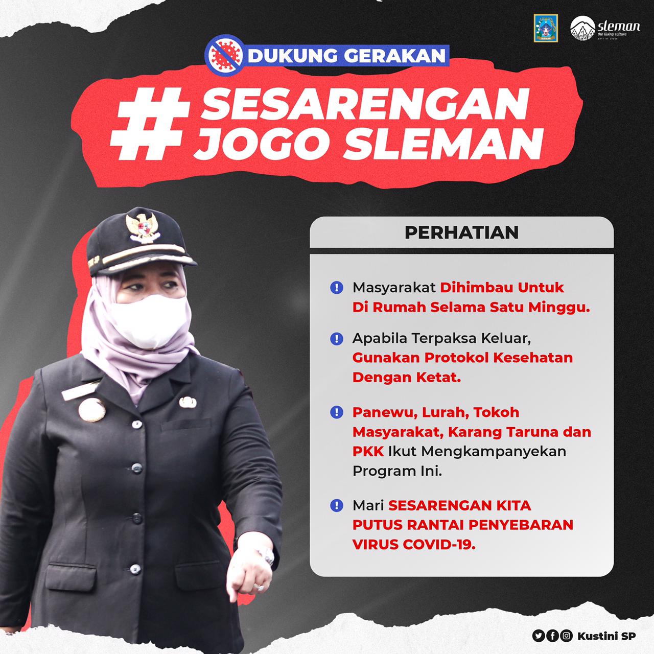 "Melalui Gerakan 'Sesarengan Jogo Sleman' kami mengimbau masyarakat Sleman untuk berada di rumah saja selama satu minggu kedepan. Ini langkah yang harus kita ambil mengingat angka penularan di Sleman selama dua minggu ini sangat mengkhawatirkan," tegas Kustini di Yogyakarta, Selasa (29/6)