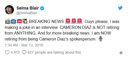 "Guys, tolonglah, aku hanya membuat sebuah lelucon pada wawancara itu. CAMERON DIAZ TIDAK pensiun dari apapun. Dan berita utama lainnya: Aku SEKARANG pensiun sebagai juru bicara Cameron Diaz," tulis Blair.