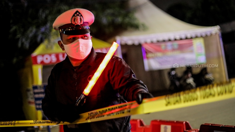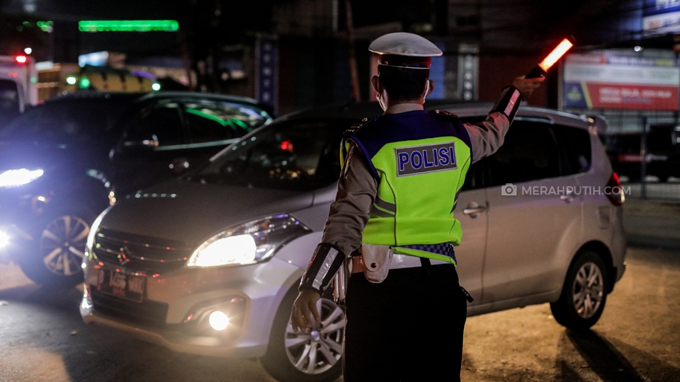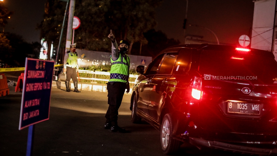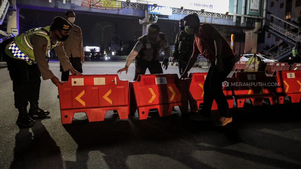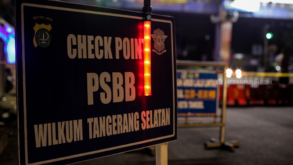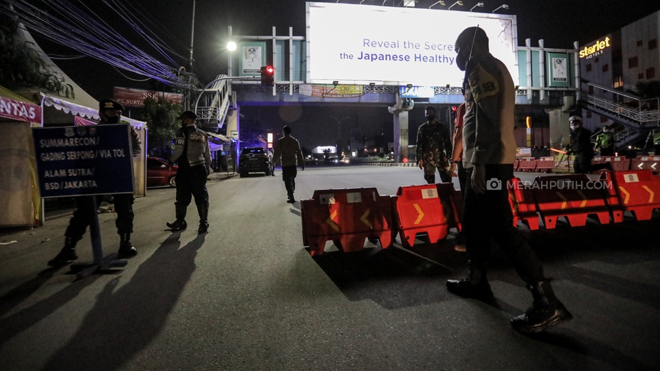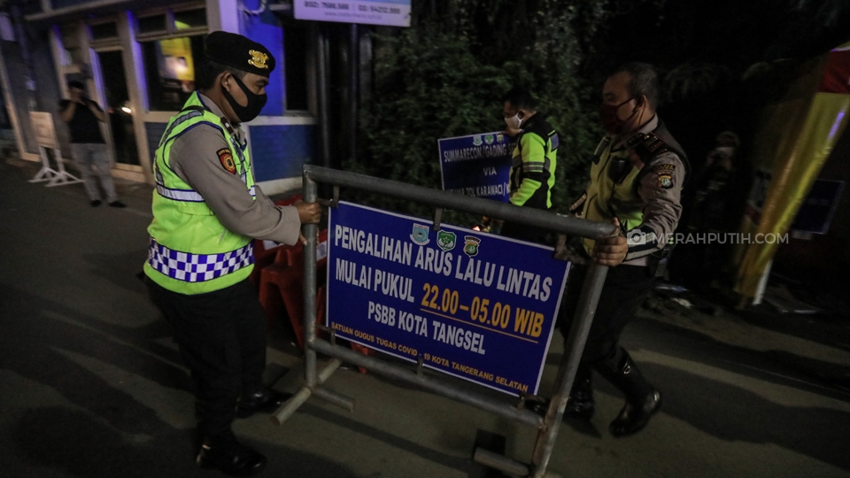 Petugas gabungan TNI-POLRI dibantu anggota Dishub dan Satpol PP melakukan pengaturan pengalihan arus lalu lintas Pembatasan Sosial Berskala Besar (PSBB) di jalan raya Serpong, Kota Tangerang Selatan, Banten, Senin, (11/5/2020). Pengalihan arus lalu lintas tersebut telah dimulai sejak Sabtu (9/5/2020) dari pukul 22.00 - 05.00 WIB. Upaya tersebut dilakukan untuk memutus penyebaran COVID-19 di kota Tangerang Selatan. Merahputih.com / Rizki Fitrianto