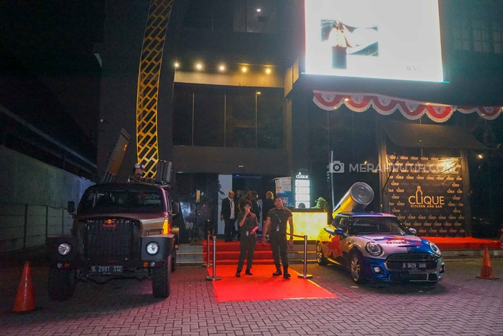 KARPET merah sepanjang 3 meter membentang di depan pintu masuk Clique Kitchen & Bar, Gading Serpong, Tangerang Selatan, Rabu (31/8) malam. Di sampingnya terparkir mobil berwarna hitam dove dengan atap terbuka. Terlihat seorang disc jockey (DJ) asyik memainkan alunan musik EDM dengan tempo cepat di dalam mobil tersebut.