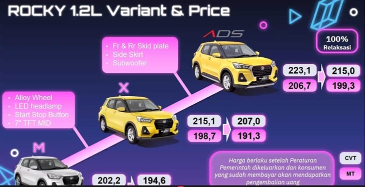 Pemerintah sendiri berencana memperpanjang relaksasi PPnBM 100 persen bulan Juni hingga Agustus. Tapi peraturan itu belum keluar. Kendati demikian, Daihatsu memberikan skema harga PPnBM 50% dan 100% untuk Daihatsu Rocky 1.2.