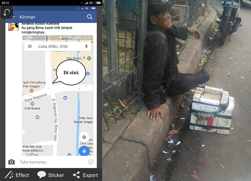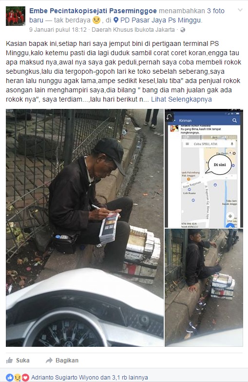 Seperti biasa sang pemilik akun facebook melakukan rutinitas sehari-harinya untuk menjemput istri di pertigaan terminal Pasar Minggu. Setiap hari itu pula ia melihat seseorang yang duduk dengan barang dagangannya sambil corat-coret koran.