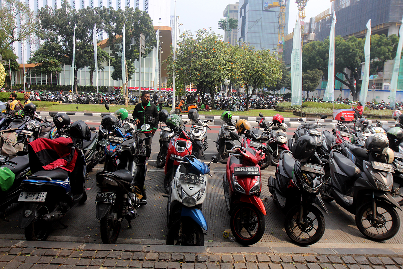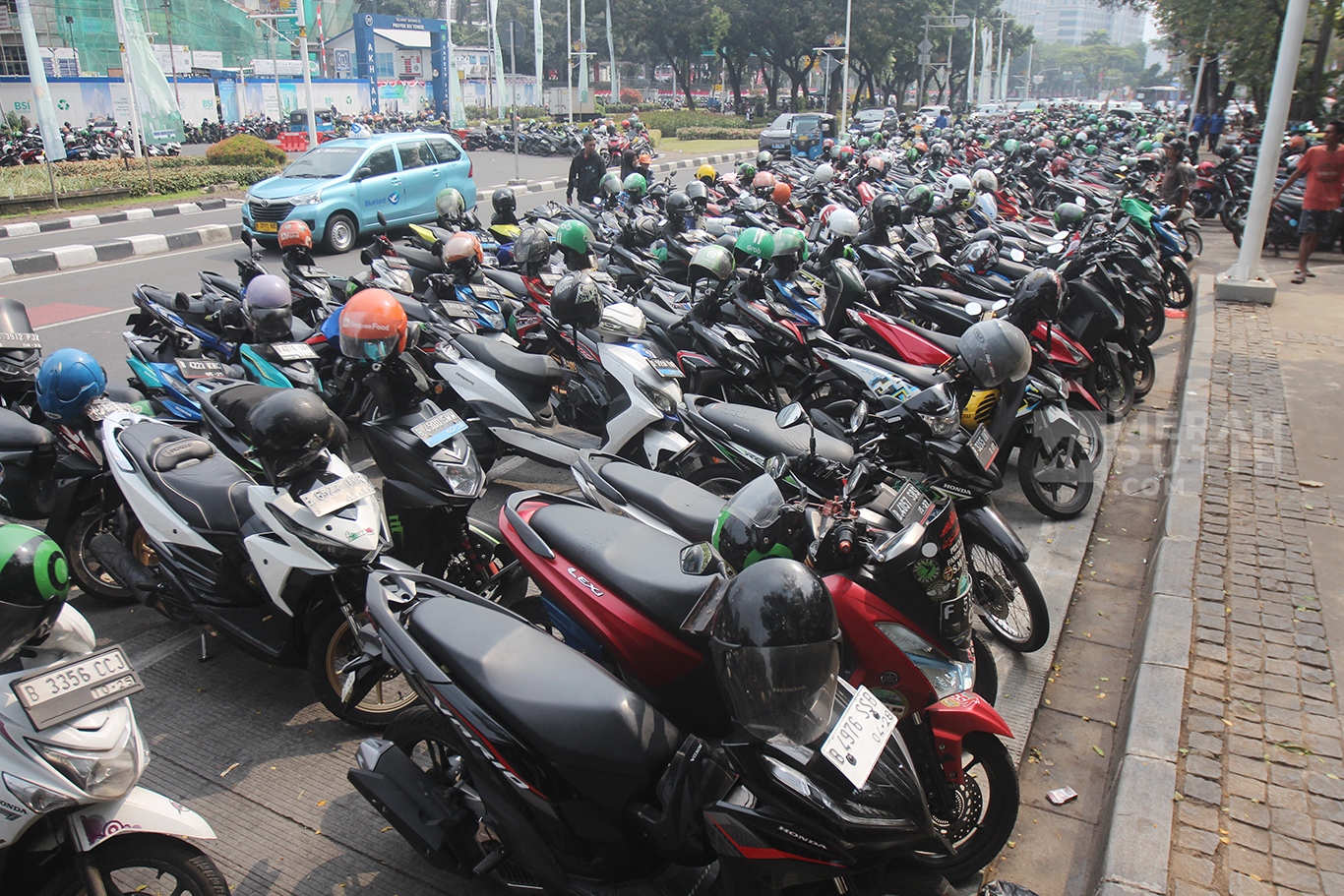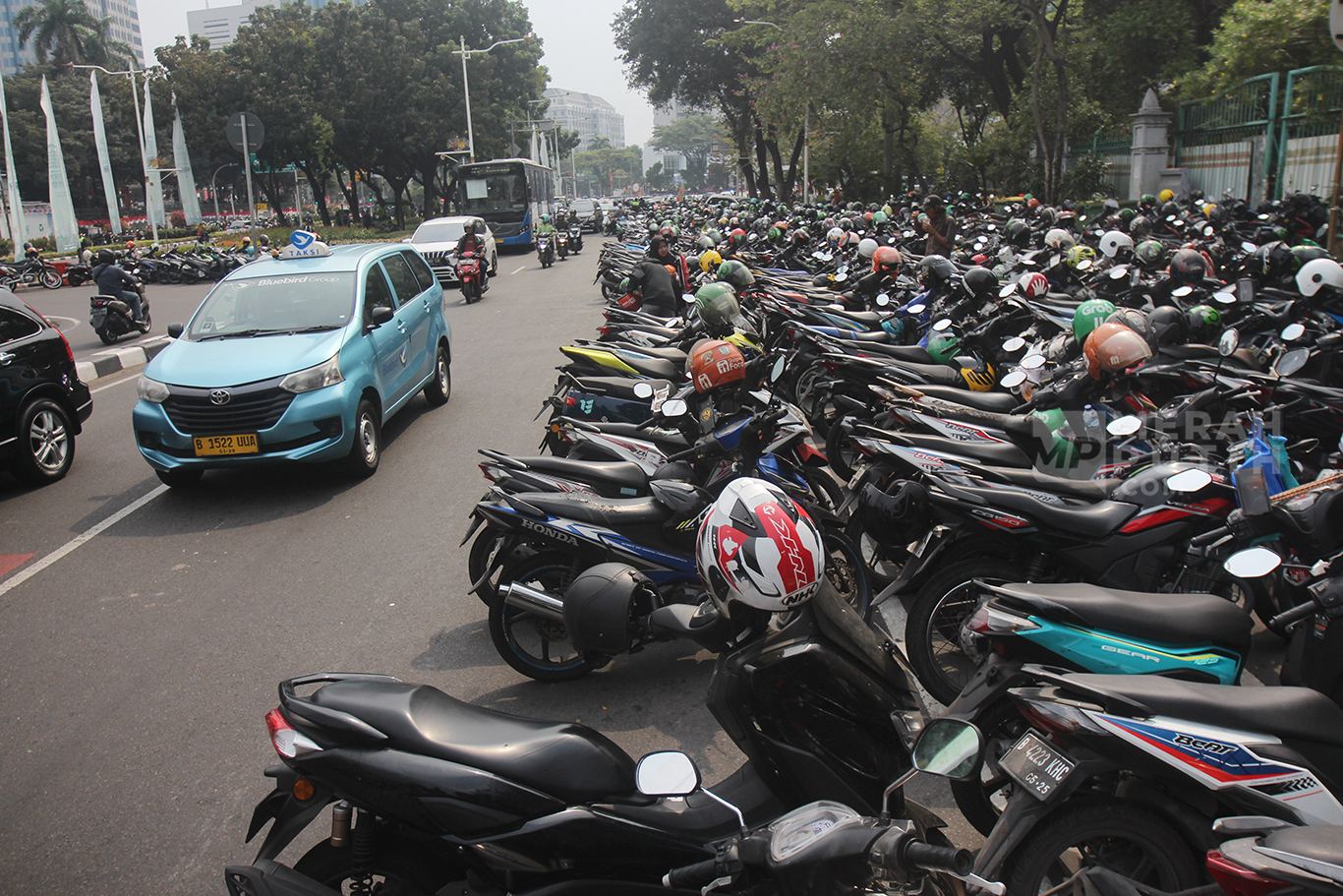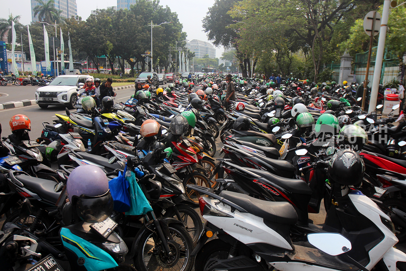 MerahPutih.com - Deretan sepeda motor pengemudi ojek online (Ojol) dan Kurir Online saat parkir di Kawasan Patung Kuda, Jalan Medan Merdeka Barat, Jakarta Pusat, Kamis (29/8/2024).