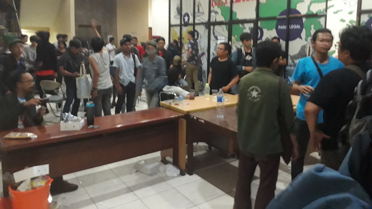 Sekitar pukul 01.10, di dalam gedung YLBHI, para peserta dan panitia bersatu padu menaruh sejumlah kursi di balik pintu depan dan pintu samping YLBHI. Hal tersebut untuk mengantisipasi jika polisi tak mampu membendung massa aksi yang memaksa masuk ke dalam YLBHI. Suasana di dalam semakin panik.