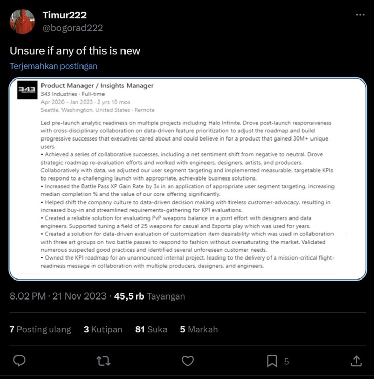 Menurut profil tersebut, Ben F bekerja di studio tersebut hingga Januari 2023 dan telah terlibat dalam pengembangan proyek baru tersebut. Meskipun tidak ada rincian lebih lanjut yang diberikan, tetap bisa dipastikan 343 Industries tengah fokus menciptakan game baru.