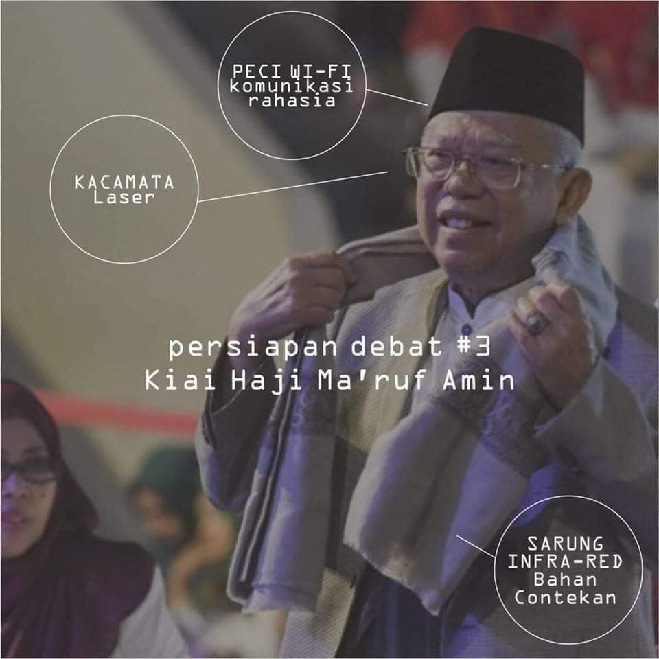 Pada gambar meme tersebut, terlihat beberapa perlengkapan canggih yang disebut akan digunakan oleh cawapres 01 Ma'ruf Amin. Tampak beberapa alat canggih yang disebut akan 'digunakan' oleh mantan Rais Aam PBNU itu seperti peci wi-fi komunikasi rahasia dan kacamata laser.