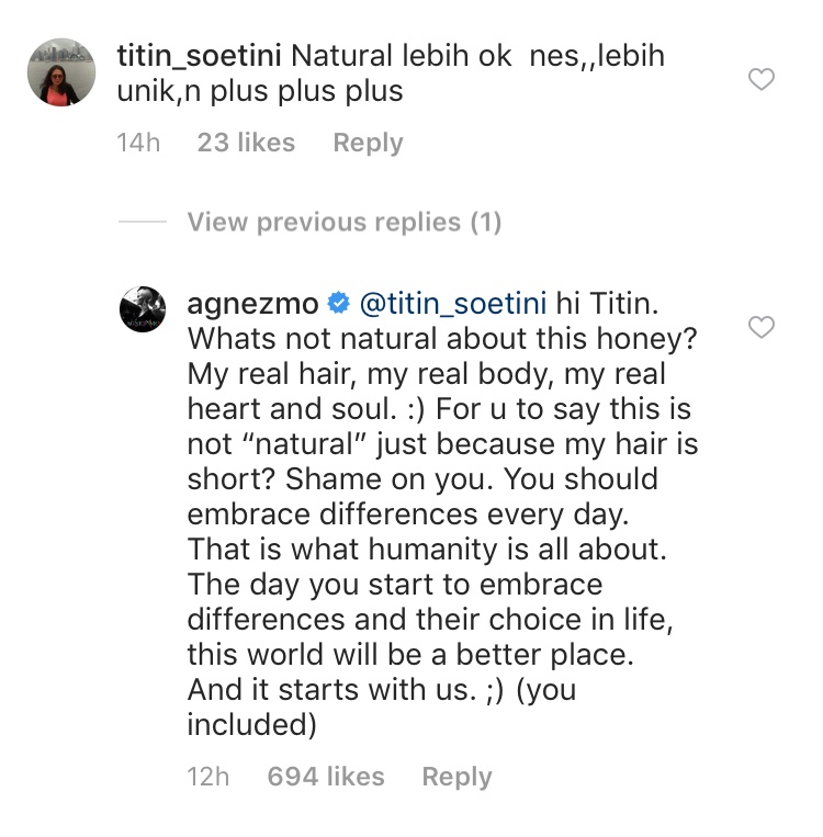 Melihat komentar tersebut, secara mengejutkan Agnez Mo langsung membalas kritik dari seorang warganet itu. Dengan bijak Agnez mengimbau bahwa setiap orang harus menghargai segala perbedaan.