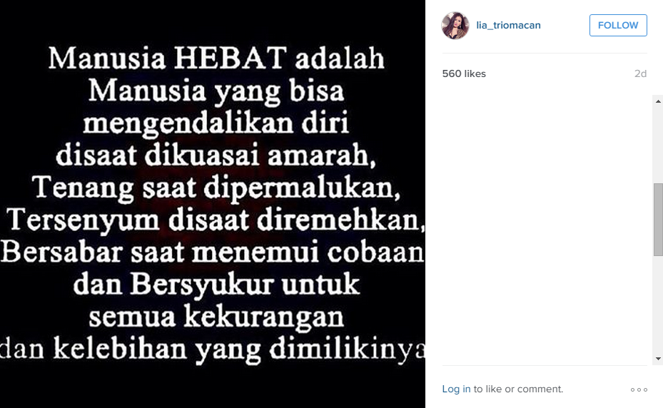 "Manusia HEBAT adalah Manusia yang bisa mengendalikan diri disaat dikuasai amarah. Tenang saat dipermalukan. Tersenyum disaat diremehkan. Bersabar saat menemui cobaan dan Bersyukur untuk semua kekurangan dan kelebihan yang dimilikinya," tulis kalimat yang diunggah Lia dalam sebuah foto di Instagram.