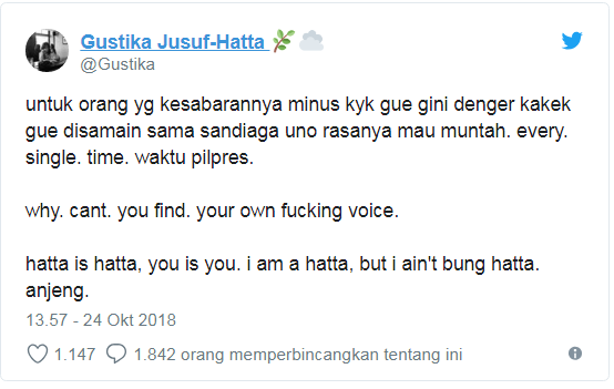 "Untuk orang yg kesabarannya minus kyk gue gini denger kakek gue disamain sama sandiaga uno rasanya mau muntah. every. single. time. waktu pilpres. why. cant. you find. your own fucking voice," tulis Gustika.