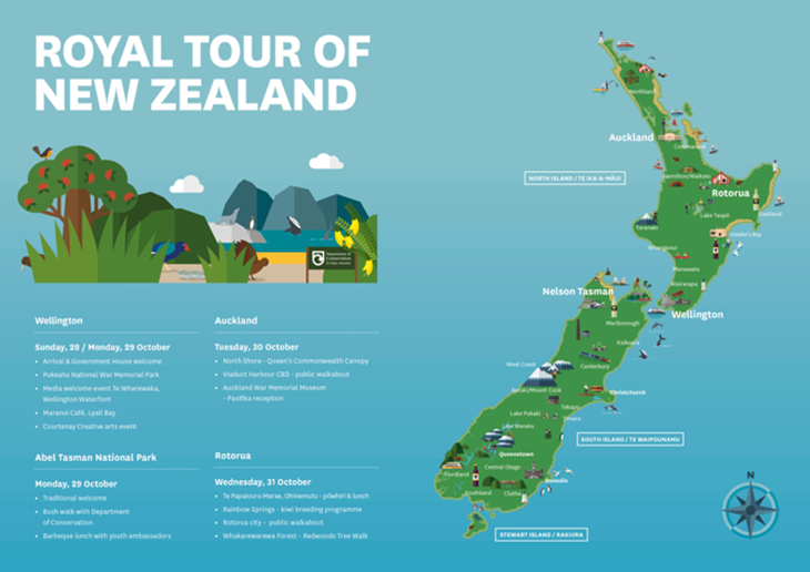 Kunjungan mereka berdua ke Auckland bertujuan memberikan area konservasi seluas 20 hektare yang masih terjaga keasliannya kepada The Queen's Commonweath Canopy. Mereka juga menyempatkan untuk turun langsung ke jalanan dan menyapa para penggemar yang berkumpul di Viaduct Harbour. Setelah itu, kunjungan mereka dilanjutkan dengan menghadiri resepsi yang diselenggarakan oleh Perdana Menteri Jacinda Ardern di Auckland War Memorial Museum.