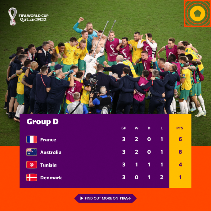 Australia keluar sebagai runner-up Grup D dengan 6 poin dari 3 laga. Anak asuh pelatih Graham Arnold ini kalah selisih gol dari Prancis yang keluar sebagai juara grup dengan perolehan poin sama.