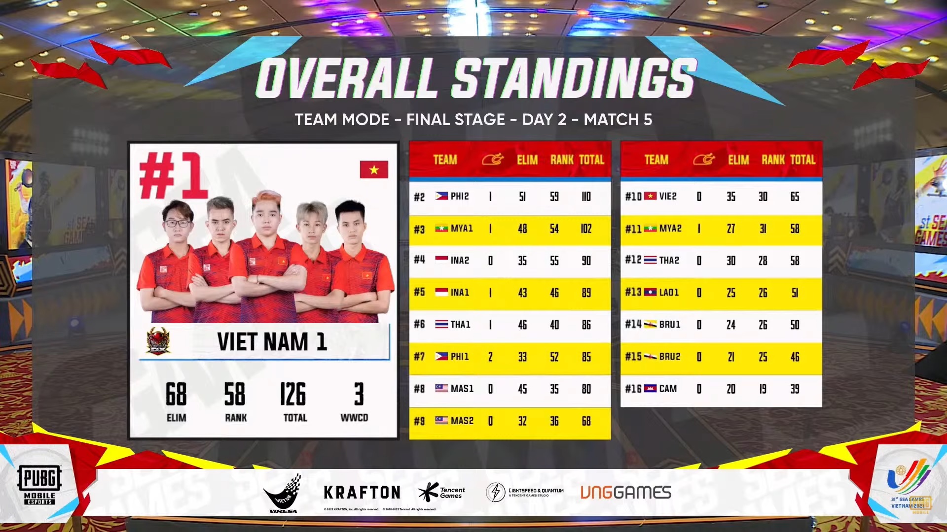 Sementara Tim Merah Putih berada di bawahnya dengan skor elim 43 poin, skor rank 46 poin, dan total raihan 89 poin. Kedua tim masing-masing terpaut 36 dan 37 poin dari Tim Vietnam 1 dengan total raihan 126 poin. (waf)