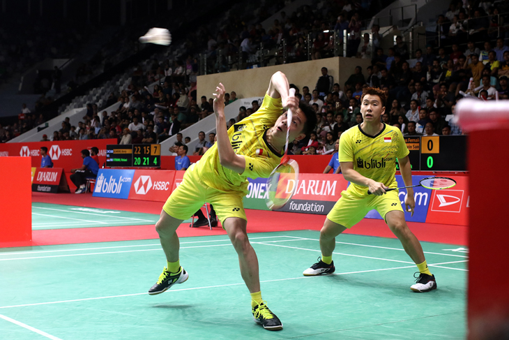 Sebelumnya, unggulan pertama Kevin Sanjaya Sukamuljo/Marcus Fernaldi Gideon menyisihkan Tinn Isriyanet/Kittisak Namdash (Thailand), dengan skor 21-16, 21-16.
