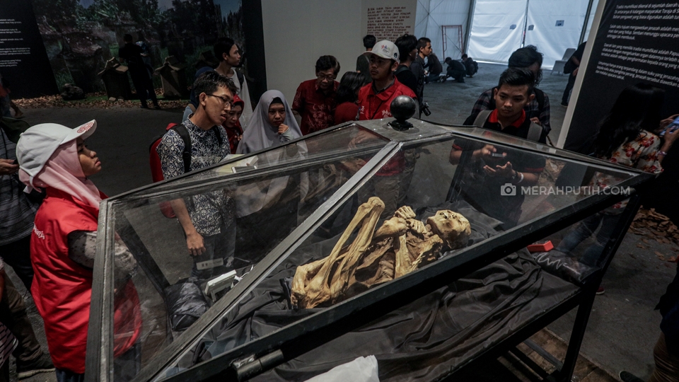 Pengunjung mengamati sebuah mumi yang berasal dari Balai Pelestarian Cagar Budaya Sulawesi Selatan saat mengunjungi Pekan Kebudayaan Nasional 2019 di Istora Senayan, Komplek Gelora Bung Karno (GBK), Jakarta, Kamis, (10/10/2019). Pekan Kebudayaan Nasional 2019 yang diselenggarakan oleh Kementerian Pendidikan dan Kebudayaan (Kemendikbud) telah berlangsung sejak 7-13 Oktober di Istora Senayan. Pagelaran tersebut juga akan menyuguhkan beragam pertunjukkan, mulai dari ekshibisi kebudayaan, pergelaran karya budaya bangsa, hingga konferensi pemajuan kebudayaan. Merahputih.com / Rizki Fitrianto