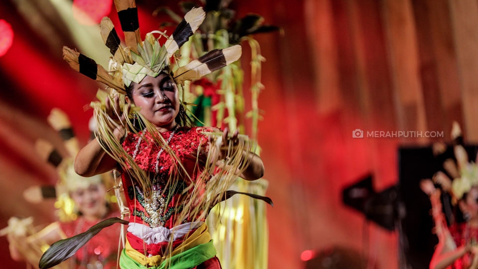 Sejumlah penari membawakan tarian dari suku Dayak saat tampil di Panggung Kaibauk Pekan Kebudayaan Nasional 2019 di Istora Senayan, Komplek Gelora Bung Karno (GBK), Jakarta, Kamis, (10/10/2019). Pekan Kebudayaan Nasional 2019 yang diselenggarakan oleh Kementerian Pendidikan dan Kebudayaan (Kemendikbud) telah berlangsung sejak 7-13 Oktober di Istora Senayan. Pagelaran tersebut juga akan menyuguhkan beragam pertunjukkan, mulai dari ekshibisi kebudayaan, pergelaran karya budaya bangsa, hingga konferensi pemajuan kebudayaan. Merahputih.com / Rizki Fitrianto