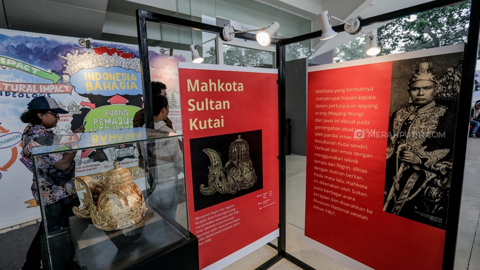Instalasi pameran mahkota raja Kutai terpajang di Pekan Kebudayaan Nasional 2019 di Istora Senayan, Komplek Gelora Bung Karno (GBK), Jakarta, Kamis, (10/10/2019). Pekan Kebudayaan Nasional 2019 yang diselenggarakan oleh Kementerian Pendidikan dan Kebudayaan (Kemendikbud) telah berlangsung sejak 7-13 Oktober di Istora Senayan. Pagelaran tersebut juga akan menyuguhkan beragam pertunjukkan, mulai dari ekshibisi kebudayaan, pergelaran karya budaya bangsa, hingga konferensi pemajuan kebudayaan. Merahputih.com / Rizki Fitrianto