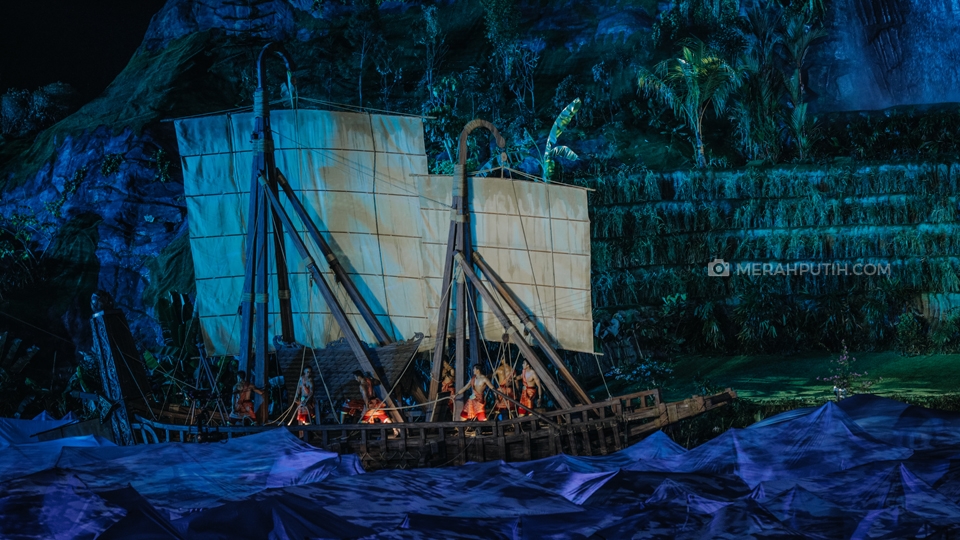 Penyanyi Maruli Tampubolon pada penampilan kolosalnya diatas kapal dengan diiringi sejumlah penari membawakan lagu-lagu daerah pada pembukaan Asian Games ke-18 di SUGBK, Jakarta. Merahputih.com / Rizki Fitrianto