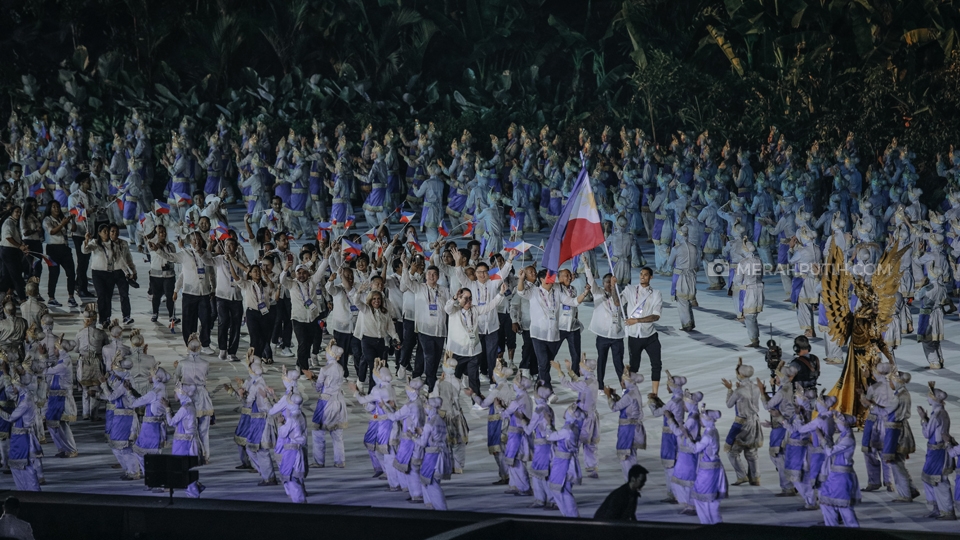 Defile kontingen atlet Indonesia yang dipimpin Komjen (purn) Syafruddin sebagai Chef de Mission pada Asian Games ke-18 di SUGBK, Jakarta. Sebanyak 1.000 atlet akan wakilkan Indonesia disemua cabang olahraga. Merahputih.com / Rizki Fitrianto