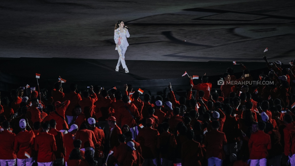 Usai Defile kontingen altet, pedangdut Via Vallen menghibur puluhan ribu penonton dengan membawakan lagu "Meraih Bintang" yang sekaligus menjadi official sound track Asian Games 2018 pada upacara pembukaan Asian Games ke-18 di Stadion Utama Gelora Bung Karo, Jakarta. Via Vallen tampil dengan mengenakan Narcis Bandit Batik karya desainer lokal Olive. Merahputih.com / Rizki Fitrianto