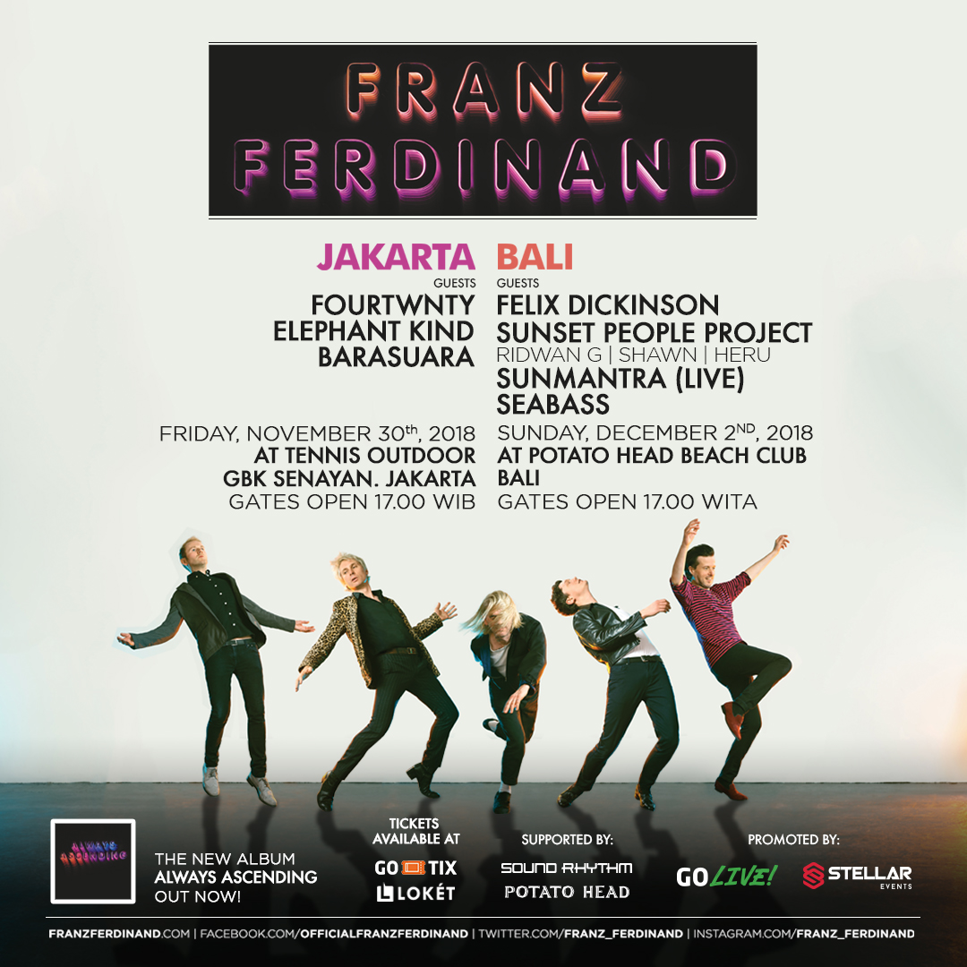 Band rock sensasional Franz Ferdinand yang telah suskes mencapai penjualan tertinggi. Mereka juga berhasil memacu adrenalin penontonnya bersemangat dan merasa puas pada setiap konsernya. Franz Ferdinand sebelumnya pernah singgah di Jakarta pada 14 November 2009 silam. Kali ini grup band yang digawangi oleh Alex Kapranos, Nicholas McCarthy, Robert Hardy dan Paul Thomson akan menghentak Jakarta dalam rangka mempromosikan albumnya di tahun 2018 yang bertajuk Always Ascending.