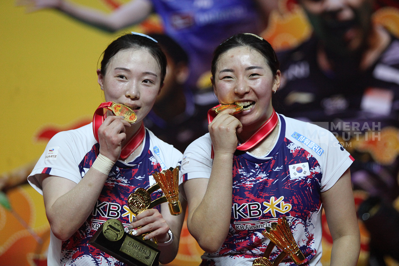 Merahputih.com - Ganda Putri Korea Kim Hye-jeong/Kong Hee-yong mengangkat piala dan medali Juara Indonesia Masters 2025 di Istora Senayan, Jakarta, Minggu (26/1/2025).