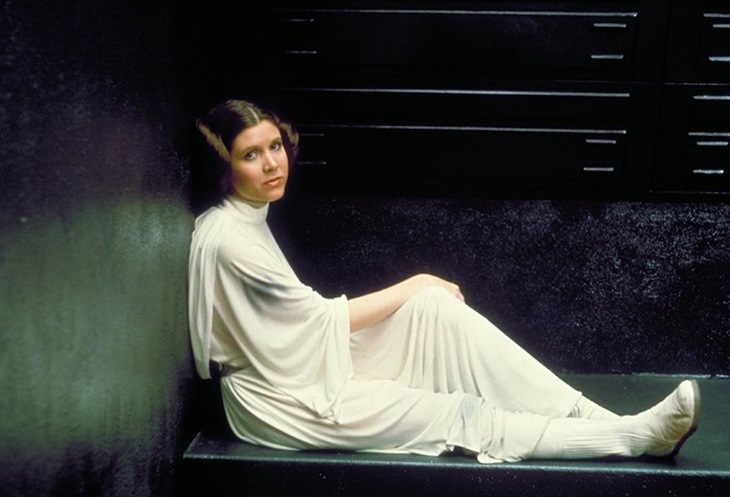 Fisher mengenakan gaun putih mengalir dan sabuk kulit perak itu di adegan terakhir film di ruang singgasana saat dia menganugerahkan medali kehormatan kepada Luke Skywalker dan Han Solo.