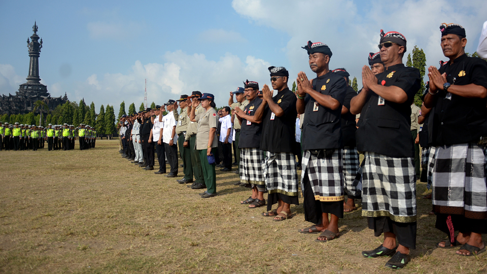 Pecalang atau pengamanan adat Bali mengikuti Gelar Pasukan Operasi Ketupat Agung 2018 di Lapangan Monumen Bajra Sandhi Denpasar. Gelar pasukan yang diikuti 1.400 personel yang terdiri dari TNI, Polri, Dinas Perhubungan, BPBD, Satpol PP, Pecalang dan Pramuka tersebut untuk memastikan pelaksanaan arus mudik dan balik Lebaran di Pulau Dewata berjalan aman dan lancar. ANTARA FOTO/Wira Suryantala