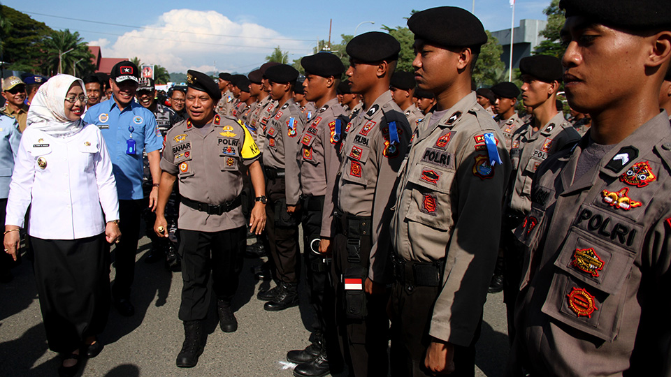 Kapolda Sulawesi Barat (Sulbar) Brigjen Pol Baharuddin Djafar (kedua kiri) didampingi Wakil Gubernur Sulbar Enny Anggraeny Anwar (kiri) melakukan pemeriksaan pasukan saat apel Operasi Ketupat, di Mamuju, Sulawesi Barat. Polri, Tni dan Pemerintah Sulawesi Barat menurunkan 1.618 personil dalam Operasi Ketupat 2018 untuk pengamanan Idul Fitri 1439 Hijriah di wilayah Sulbar. ANTARA FOTO/ Akbar Tado