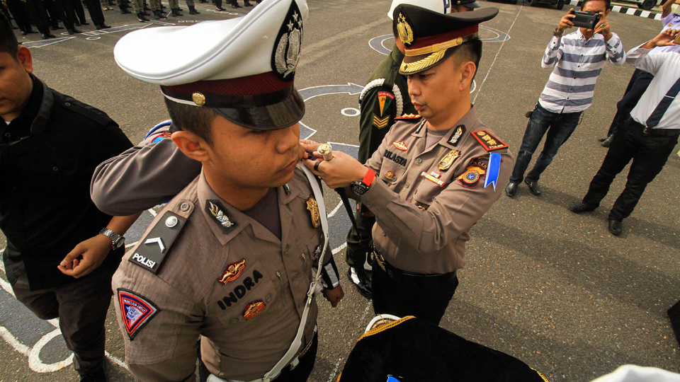 Kapolres Lhokseumawe, AKBP Ari Lasta Irawan (kanan) memasang pita tanda Operasi saat Apel Operasi Ketupat Rencong 2018 di Lhokseumawe, Aceh. Polda Aceh mengerahkan 2/3 kekuatan atau sekitar 9.500 personel lebih dan gabungan personel POM TNI, Dishub/LLAJ, Dinas Kesehatan, Satpol PP, Pemadam Kebakaran, dan Orari/RAPI, serta mendirikan 100 pos terdiri 70 pos pengamanan, 30 pos pelayanan selama 18 hari terhitung 7-24 Juni 2018. ANTARA FOTO/Rahmad