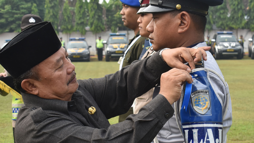 Bupati Madiun Muhtarom (kiri) menyematkan pita pada peserta saat Apel Gelar Pasukan Operasi Ketupat 2018 di lapangan Mapolres Madiun, Jawa Timur. Operasi ketupat diselenggarakan secara serentak di seluruh Indonesia selama 18 hari mulai 7 hingga 24 Juni 2018 dalam rangka pengamanan Lebaran. ANTARA FOTO/Siswowidodo
