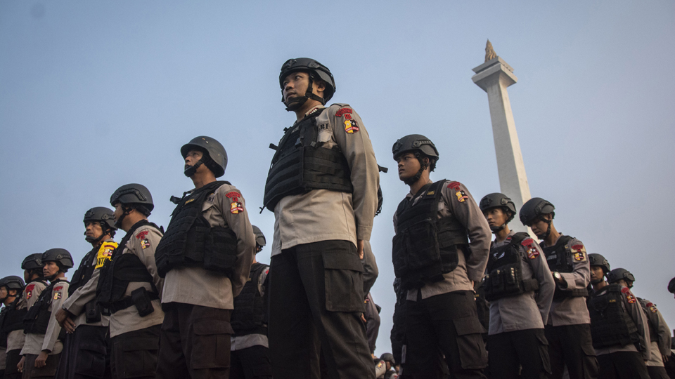 Personel Korps Brimob Mabes Polri mengikuti apel gelar pasukan Operasi Kepolisian Terpusat Ketupat 2018 di Monas, Jakarta. Apel tersebut dalam rangka pengamanan Idul Fitri 1439 H. ANTARA FOTO/Aprillio Akbar