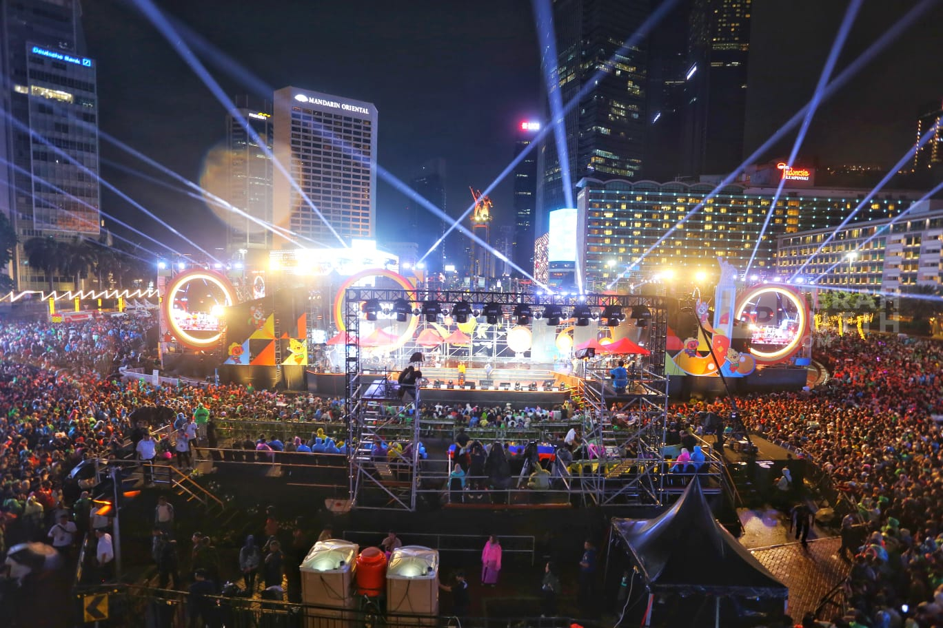 Kemeriahan malam pergantian Tahun Baru 2026 di Jakarta tersaji melalui atraksi cahaya dan panggung hiburan yang dipusatkan di kawasan Bundaran Hotel Indonesia (HI), Jakarta Pusat. Sejumlah musisi papan atas Tanah Air turut memeriahkan suasana, di antaranya D’Masiv, Admesh, Feel Koplo, Marion Jola, serta Gondal Gandul Band, yang tampil menghibur ribuan warga hingga menjelang detik-detik pergantian tahun.
