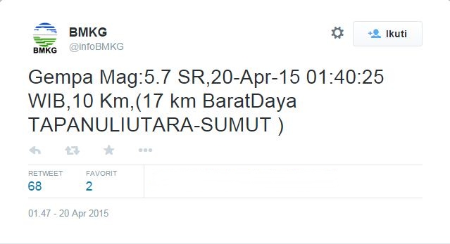 Gempa 5,7 SR Guncang Tapanuli Utara