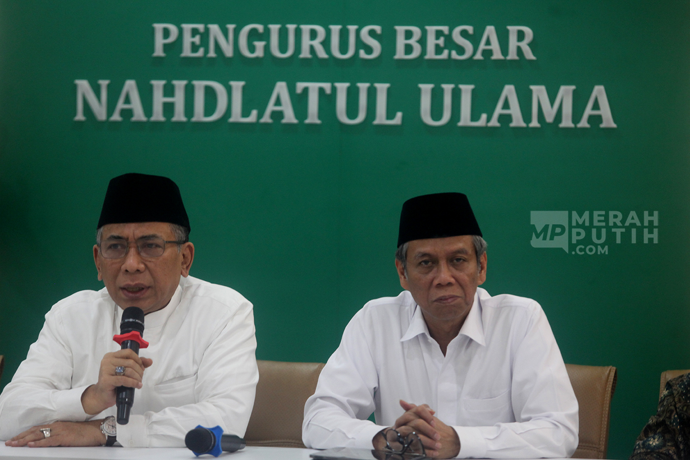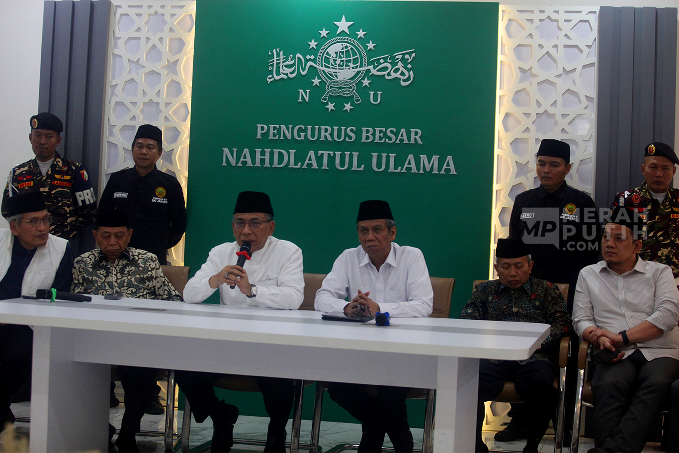 Merahputih.com - Ketua Umum Pengurus Besar Nahdlatul Ulama (PBNU) KH Yahya Cholil Staquf alias Gus Yahya (kiri) bersama Sekjen PBNU H. Amin Said Husni saat menyampaikan keterangan pers di Kantor PBNU, Jakarta, Rabu (3/12/2025).