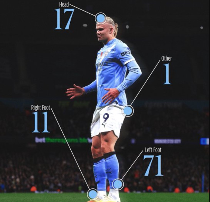 Sejak pertandingan pertamanya untuk Manchester City pada Agustus 2022, tak ada pemain lain yang mampu menandingi laju gol Haaland. Ia mencetak 28 gol lebih banyak daripada pesaing terdekatnya dalam daftar pencetak gol selama periode tersebut. Mohamed Salah berada di urutan kedua dengan 70 gol, diikuti oleh Alexander Isak di posisi ketiga dengan 55 gol.