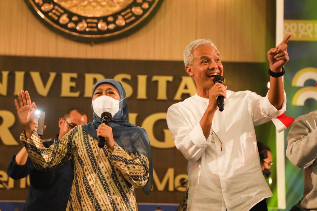 "Terima kasih banyak pak Ganjar, bu Khofifah yang sudah berkenan hadir. Di sela waktu beliau-beliau yang sangat sibuk sekali, bisa menyempatkan hadir ke sini. Ini luar biasa, jadi kalian mahasiswa baru harus benar-benar memanfaatkan momentum ini untuk belajar dari tokoh-tokoh nasional ini," katanya. (Budi Lentera/Surabaya)