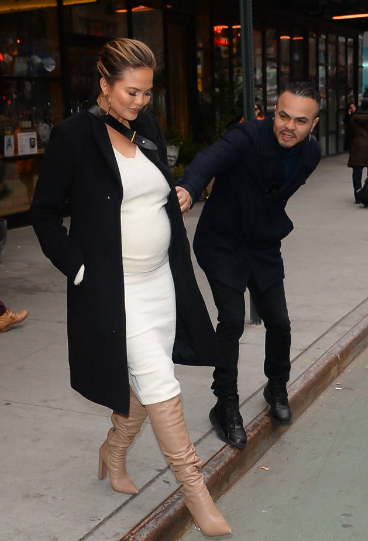 Dalam foto tersebut Teigen tampak ingin menyebrang dengan menggunakan mantel hitam dalaman dress putih untuk ibu hamil. Ia juga menggunakan sepatu bot berwarna krem.